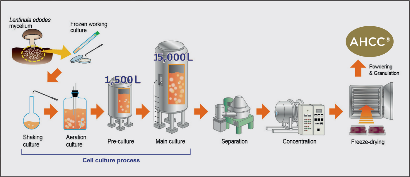 AHCC is produced through a highly controlled fermentation process using the mycelium of the shiitake mushroom (Lentinula edodes).